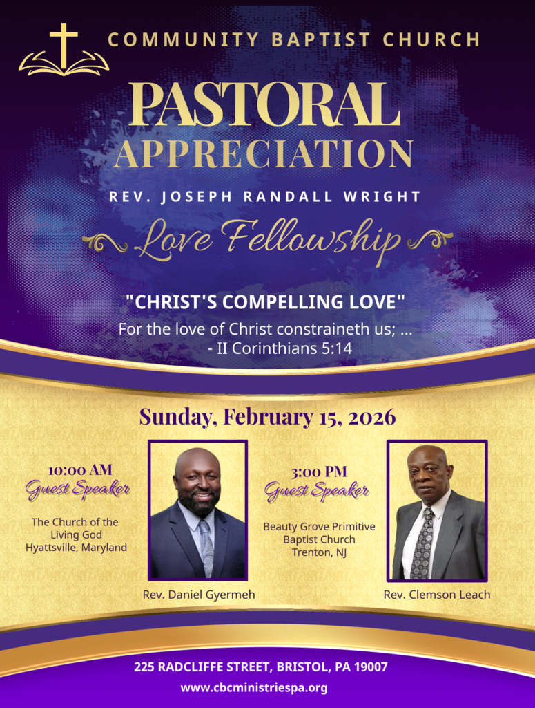 Our Sunday Worship Service begins at 10:00 AM and we are available online at www.cbcministriespa.org or Facebook @ www.facebook.com/cbcministriespa.
